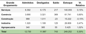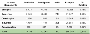 Na agropecuária foram admitidos na cidade 340 novos empregados e desligados 385, uma variação de 1,02%. No comércio foram admitidos 3.690 e desligados cerca de 3.321, com uma variação relativa positiva de 0,60%. O setor da indústria admitiu 1.320 pessoas e destruiu 1.195 empregos, deixando uma variação relativa de 0,47%. Na área de serviços foram criados 6.392 novos vínculos empregatícios e destruídos 6.175 empregos, uma variação de 0,15%. E a construção contratou novos 1.109 empregados e desligou 1.011, restando um saldo negativo de -23, com uma variância de -0,15%. Os dados do CAGED podem ser modificados no próximo mês, já que os desligamentos e admissões podem ser encaminhados depois do prazo.