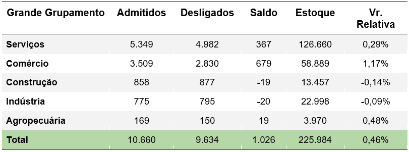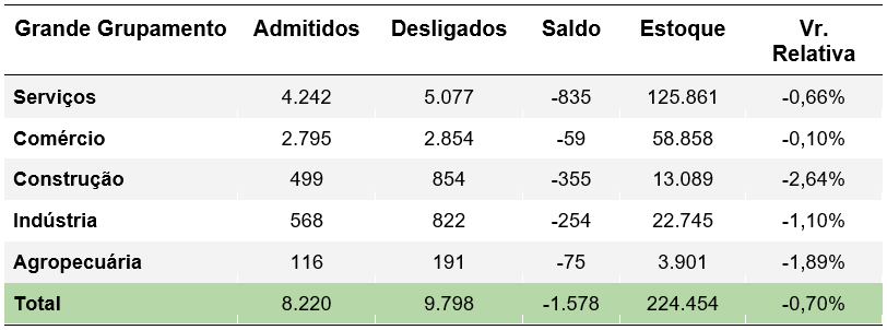 Embora nenhum dos grandes setores tenha apresentado saldo positivo no mês, nos últimos doze meses ocorreu uma geração de 12.861 empregos formais. Na agropecuária foram admitidos na cidade 116 novos empregados e desligados 191, uma variação de -1,89%. No comércio foram admitidos 2.795 e desligados cerca de 2.854, com uma variação relativa de -0,10%. O setor da indústria admitiu 568 pessoas e destruiu 854 empregos, deixando uma variação relativa de -1,10%. Na área de serviços foram criados 4.242 novos vínculos empregatícios e destruiu 5.077 empregos, uma variação de -0,66%. E a construção contratou novos 499 empregados e desligou 854, restando um saldo negativo de -355, com uma variância de -2,64%. Os dados do CAGED podem ser modificados no mês seguinte, já que os desligamentos e admissões podem ser encaminhados depois do prazo.