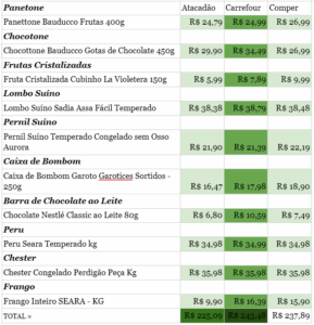 Comparando os preços do mercado Atacadão, a carne mais barata seria o Frango Inteiro Seara por quilo, com o preço de R$ 9,90, ainda no mesmo mercado, Panetone está 5 reais mais barato que o Chocotone da mesma marca (Bauducco), entre as opções de chocolate a mais em conta é a Barra de Chocolate ao Leite Garoto 80g ao preço de R$ 7,60 em comparação com os mais caros Caixa de Bombom Lacta Favoritos Caixa 250,6g e Caixa de Bombom Especialidades Nestlé Caixa 251g, ambas as caixa a R$ 18,90.