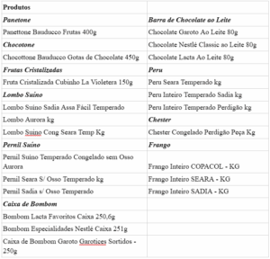 A cesta selecionada é composta por 22 itens, entre eles 13 opções de carne, 6 opções de chocolate, uma opção de fruta cristalizada, uma opção de panetone e uma opção de chocotone. O Quadro a seguir possui todos os produtos pesquisados: