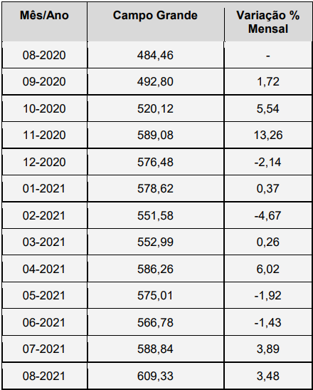 Segundo o Dieese (2021), o valor da cesta básica em Campo Grande, atualizado em agosto, atingiu R$ 609,33. De forma comparativa, o consumidor desembolsou no mesmo período do ano anterior cerca de R$ 484,46, gerou um aumento de R$ 124,87 representando um aumento de 25,77%. O preço da cesta básica para uma família composta por quatro pessoas, sendo dois adultos e duas crianças, custa em média R$ 1.827,99, referente a agosto de 2021.