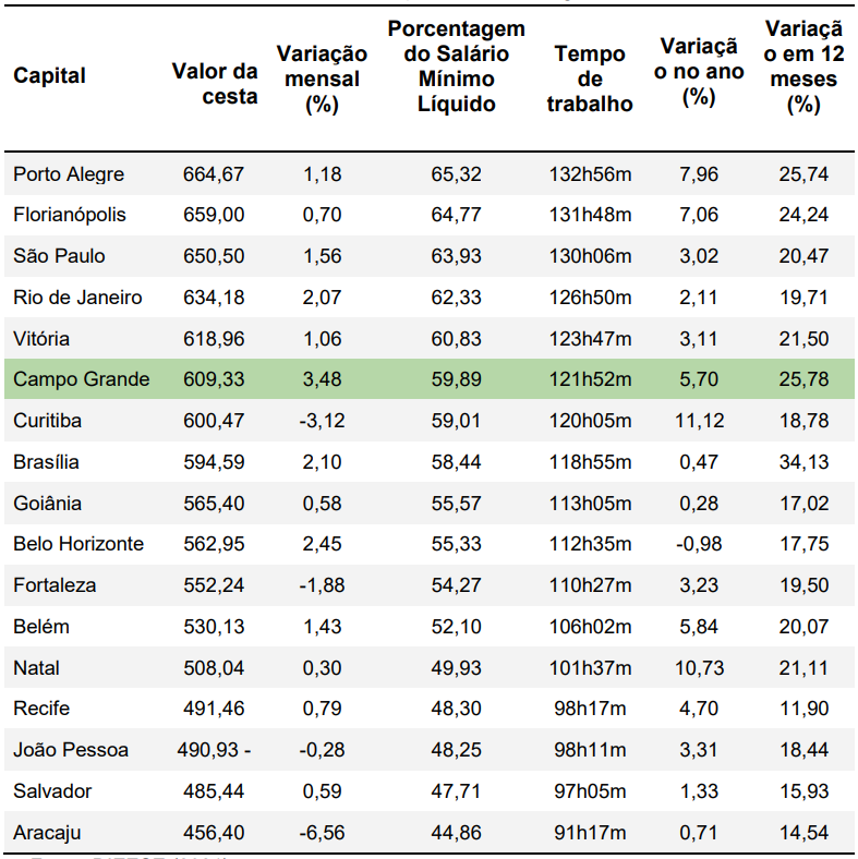 No mês passado o gasto foi de R$ 588,84, ou seja, houve um aumento de 3,48% em relação a julho e, entre as cidades analisadas, a capital sul-mato-grossense foi a que apresentou a maior alta no preço da cesta básica no mês de agosto, conforme destacado na tabela 2, ocupando a 6° posição. Tendo como base a cesta mais cara do país, Porto Alegre custando R$ 664,67, o Dieese estima que o salário mínimo necessário deveria ser equivalente a R$ 5.583,90, o que corresponde a 5,08 vezes o valor do piso atual, de R$ 1.100,00.