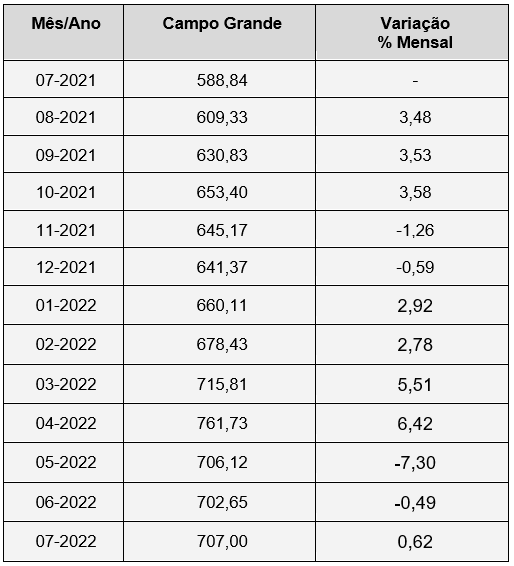 Segundo o Dieese (2022) o valor da cesta básica em Campo Grande, atualizado em Julho, atingiu R$707,00. No mês anterior o gasto foi de R$702,65, ou seja, houve uma variação de 0,62% no valor da cesta em comparação a Junho de 2022. De forma comparativa, a variação que ocorreu nos últimos doze meses foi de 20,07%. A tabela 1 mostra os preços da cesta básica na capital de Campo Grande, bem como suas variações.
