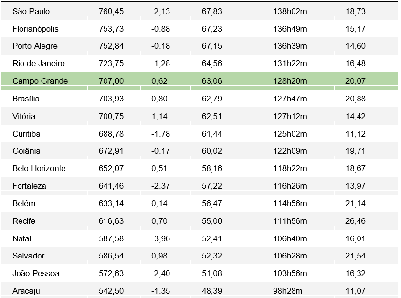Em julho de 2022, a cesta básica da cidade de São Paulo, sendo a mais cara entre as capitais pesquisadas, apresentou queda de -2,13% em relação a junho de Dieese (2022) e atingiu o valor de R$760,45. Em Campo Grande o tempo de trabalho mínimo no mês de julho foi de 128 horas e 20 minutos. No mês anterior foi preciso trabalhar 127 horas e 32 minutos para adquirir a cesta básica.