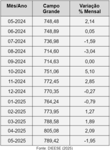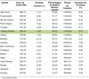Com base na cesta mais cara que, em Maio, foi a de São Paulo, segundo o Dieese (2025), o trabalhador remunerado pelo salário mínimo de R$1.518,00, mesmo com o reajuste no salário mínimo, precisou trabalhar 129 horas e 53 minutos para adquirir a cesta básica. Em Campo Grande, o tempo de trabalho mínimo necessário foi de 114 horas e 25 minutos, uma diminuição do tempo necessário comparado ao mês anterior.