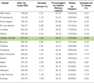 Com base na cesta mais cara que, em Novembro, foi a de São Paulo, segundo o Dieese (2023), o trabalhador remunerado pelo salário mínimo de R$1.320,00 mesmo com o reajuste no salário mínimo, precisou trabalhar 124 horas e 53 minutos para adquirir a cesta básica. Em Campo Grande, o tempo de trabalho mínimo necessário foi de 112 horas e 28 minutos, mudando a tendência de alta do último mês.