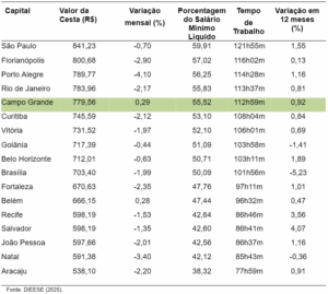 Com base na cesta mais cara que, em Outubro, foi a de São Paulo, segundo o Dieese (2025), o trabalhador remunerado pelo salário mínimo de R$1.518,00, mesmo com o reajuste no salário mínimo, precisou trabalhar 121 horas e 55 minutos para adquirir a cesta básica. Em Campo Grande, o tempo de trabalho mínimo necessário foi de 112 horas e 59 minutos, um aumento do tempo necessário comparado ao mês anterior.