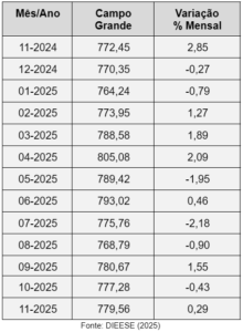 O Observatório de Economia da UFMS (OBECON) acompanha o preço da cesta básica informado pelo Departamento Intersindical de Estatística e Estudos Socioeconômicos (DIEESE) e, em especial na capital Campo Grande, procura informar a sociedade qual o reflexo de alterações no preço da cesta básica no bolso dos trabalhadores. Segundo o Dieese (2025) o valor da cesta básica em Campo Grande, atualizada em Novembro, atingiu R$779,56. Em Outubro o gasto foi de R$777,28, ou seja, houve uma variação de 0,29% no valor da cesta em comparação. O quadro 1 mostra os preços da cesta básica na capital de Campo Grande.