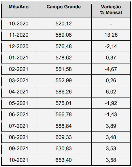 Conforme o Dieese (2021), o valor da cesta básica em Campo Grande, atualizado em outubro, atingiu R$ 653,40. De forma comparativa, o consumidor desembolsou no mesmo período do ano anterior cerca de R$ 520,12, registrando no mesmo mês do ano corrente aumento de R$ 133, representando 25,62%. O preço da cesta básica para uma família composta por quatro pessoas, sendo dois adultos e duas crianças, custa em média R$1.960,20, referente a outubro de 2021.